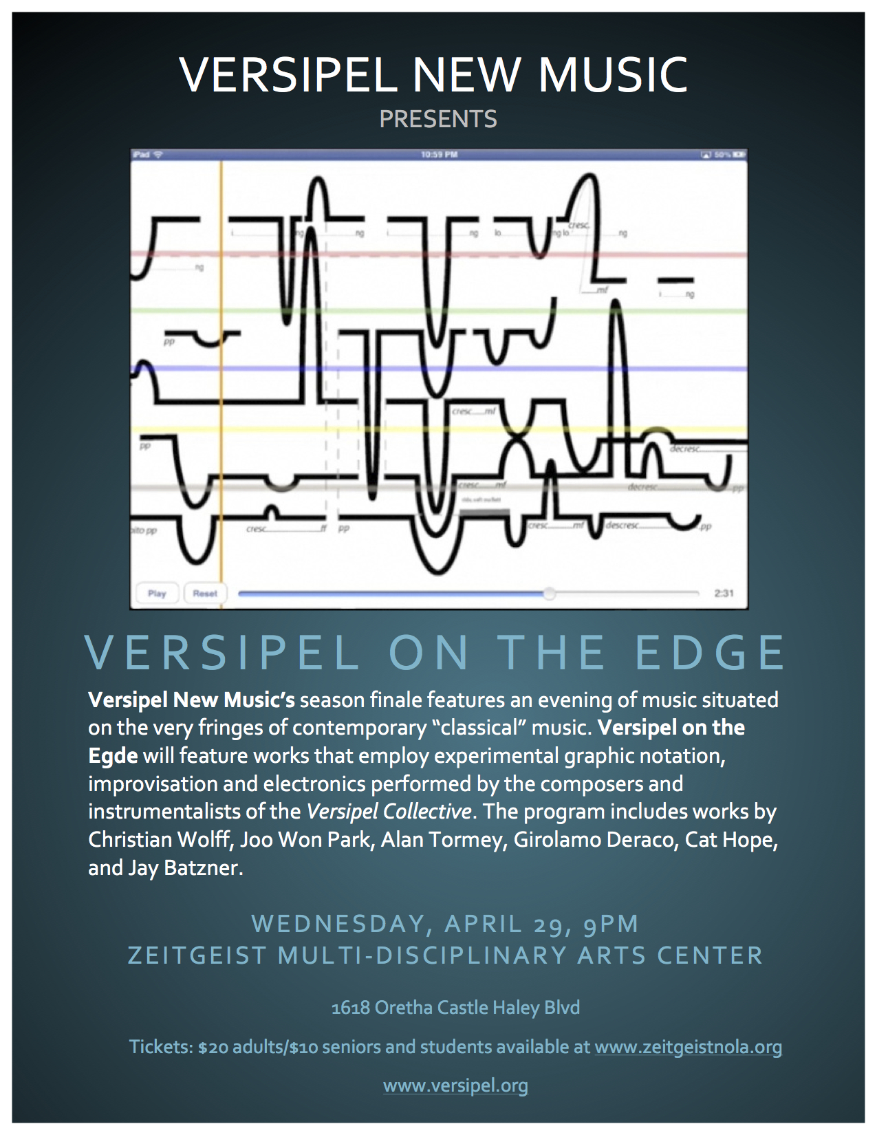 Join us for the last concert of our debut season! Versipel New Music’s season finale features an evening of music situated on the very fringes of contemporary “classical” music. Versipel on the Edge will feature works that employ experimental graphic notation, improvisation and electronics performed by the composers and instrumentalists of the Versipel Collective. This is music that explores new ways of interfacing with performers and audience members, allowing for the spontaneous creation of sounds and textures that transcends the notation of the traditional musical score.