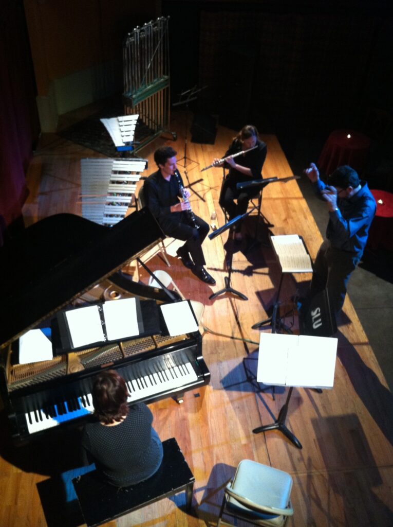 Originally conceived as a contemporary music ensemble, Mendel invited his colleague David Constantine, percussionist of the President’s Own Marine Band, to come to New Orleans and be a featured performer on nienteForte’s first concert, along with Mark Lighthiser, his former roommate from his Masters degree and his coworker at Tulane Bands, and some of his Tulane Band students. That concert featured works by Lou Harrison, Ingram Marshall, and Michael Torke, along with the world premiere of his own work Timpani Forces. Over the next few years, nienteForte existed in this form – a single spring concert of student performers that included out of town friends of Mendel and Mark that were willing to travel to New Orleans as featured performers for nothing more than free dinner and drinks.
